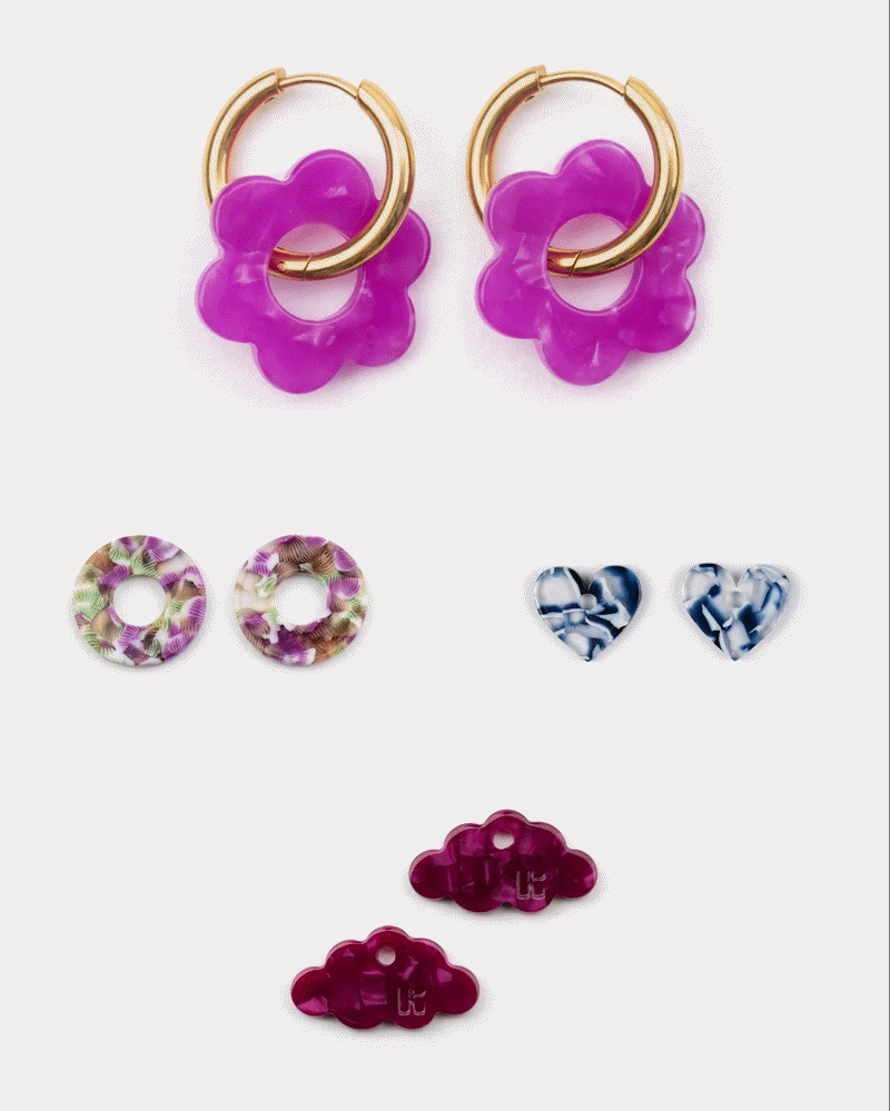 Pour sélectionner votre paire de fleurette avec anneaux et vos charms, cliquez sur le rond rose en haut à gauche afin d’ouvrir le menu déroulant et laissez parler votre créativité !